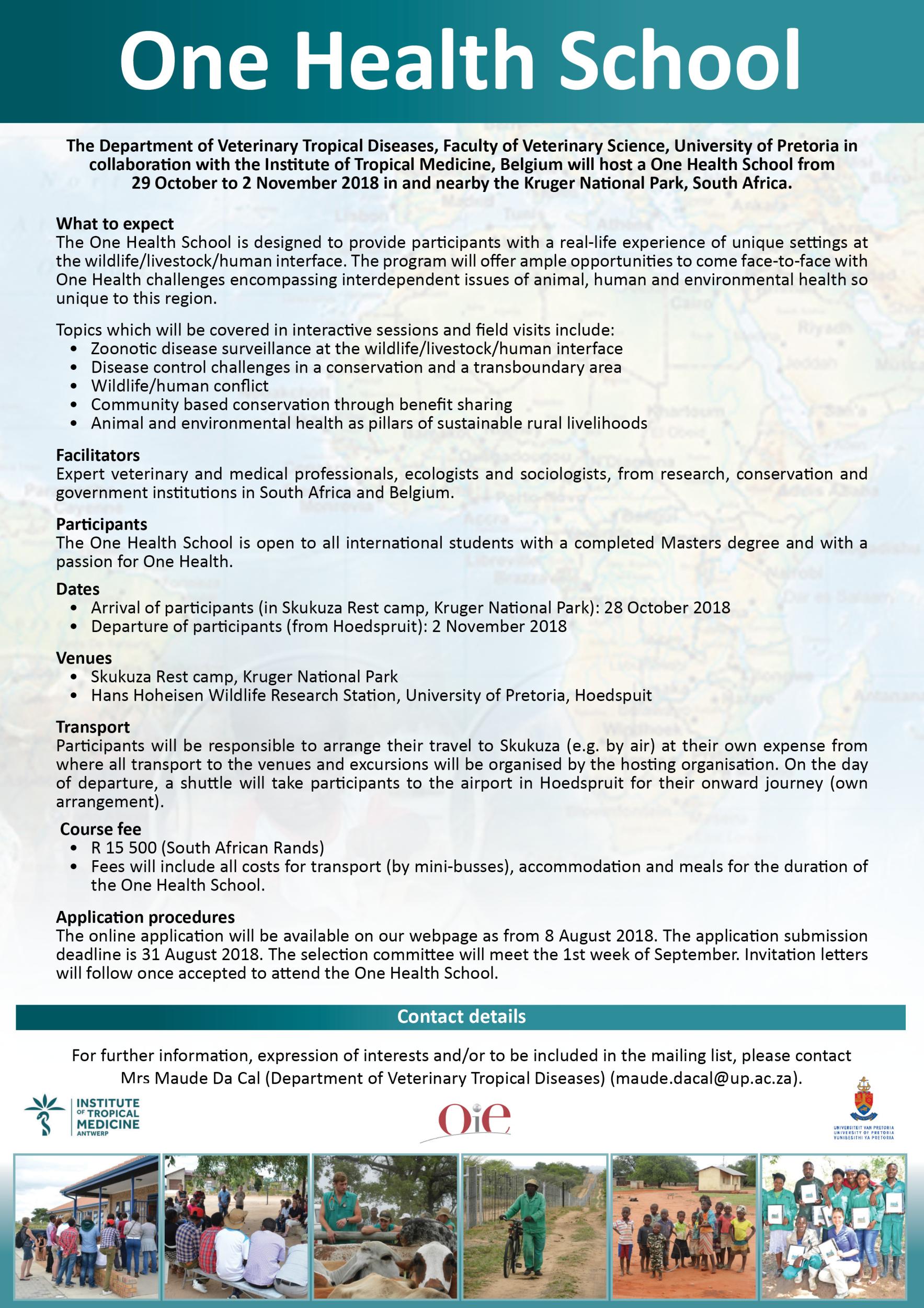 The One Health School is designed to provide participants with a real-life experience of unique settings at the wildlife/livestock/human interface. The program will offer ample opportunities to come face-to-face with One Health challenges encompassing interdependent issues of animal, human and environmental health so unique to this region.