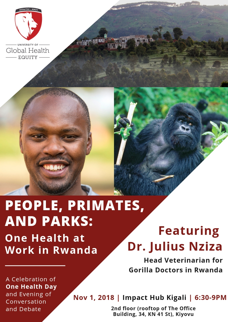 Wild mountain gorillas are the ideal One Health sentinels – their survival depends on habitat protection, controlling poaching and human conflict, preventing zoonotic disease transmission, and managing tourism activities. Gorilla Doctors, a non-profit organization working in Rwanda, Uganda and the Democratic Republic of Congo, exemplifies One Health in action. Their innovative program includes providing preventative medicine for people who contact gorillas, monitoring gorilla’s health in the wild, and protecting essential habitats. The University of Global Health Equity (UGHE) is pleased to invite students, faculty and the public to attend an evening of One Health conversation, including a keynote address by Dr. Julius Nziza, the Head Veterinarian for Gorilla Doctors in Rwanda, and followed by One Health debates.