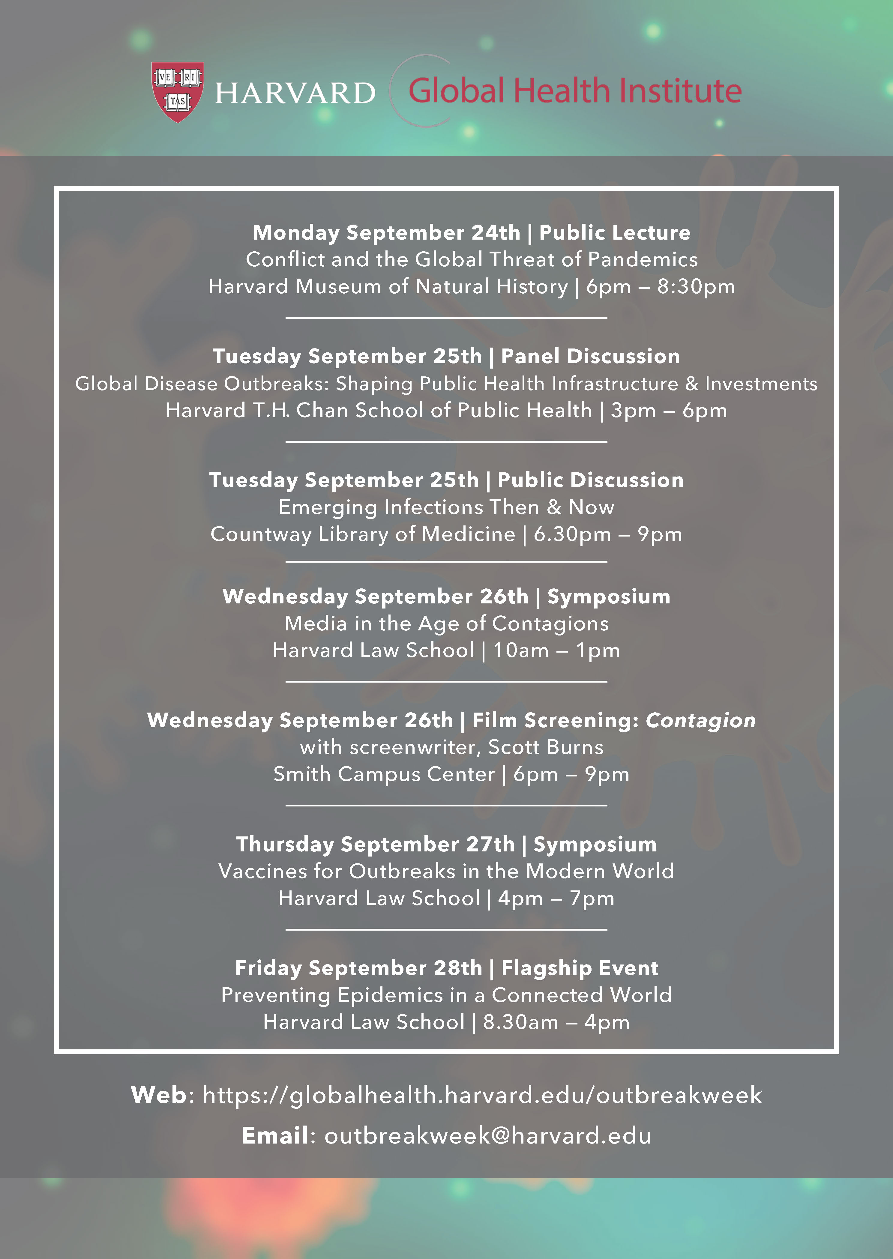 The week-long program (please see poster) involved more than 50 speakers and was accompanied by DIY panels of the Smithsonian Institution's Outbreak exhibit. Harvard University and Boston-area experts created 6 additional One-Health panels for the exhibit.