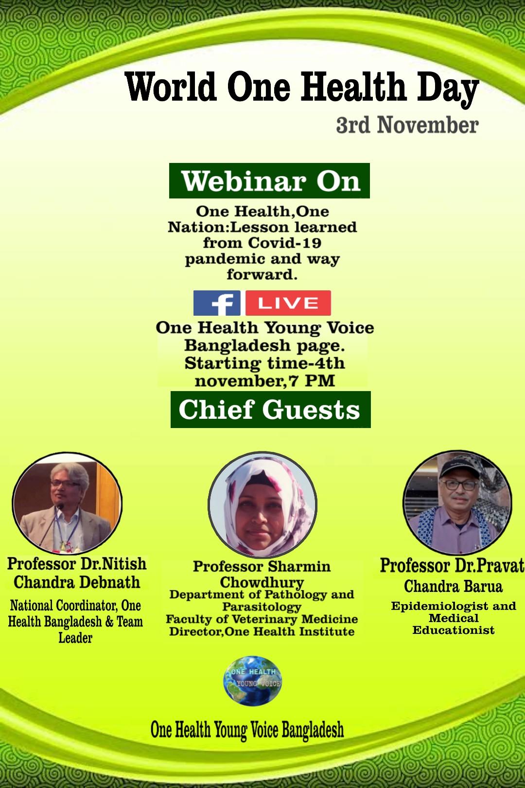 This will be a webiner which will be broadcasted in facebook live on 4th November, 2020 at 7 pm. Our chief guest will be Prof Dr Nitish Chandra Debnath Sir who is the director of One Health Bangladesh and team lead. Thr most amazing part of this program will be the student participants from different sectors. They will also present their thoughts and ideas on our topic. They will discuss on food safety, environmental pollution, veterinary health and also human medicine on pandemic vs one health relationship.